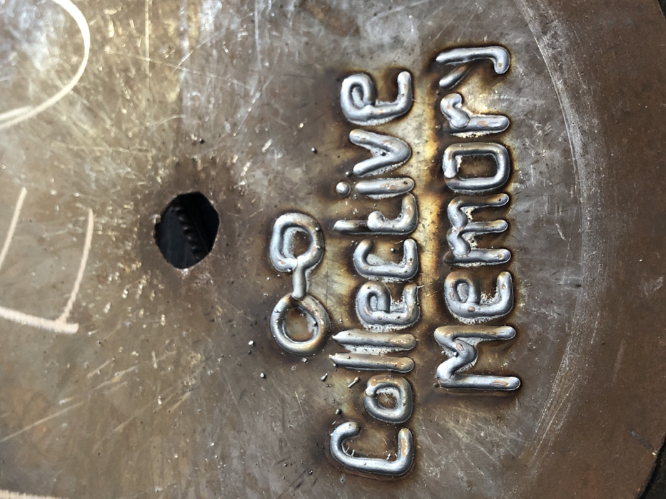 A close-up forensic examination depicts a heavily scratched and discolored metallic surface, indicative of steel or a similar alloy, with evidence of heat application, likely from welding. Centrally positioned on this surface, the words "Collective Memory" are permanently affixed via welding, with "Collective" appearing above "Memory." Above the word "Collective," a welded symbol resembling two interconnected circular or ovate forms, possibly a stylized figure-eight or linked glasses, is present. In the upper-central portion of the metal, a dark, irregularly shaped circular aperture reveals internal components, specifically a visible gear-like or serrated mechanism. Faint, chalk-like or painted white markings are partially discernible in the upper right quadrant of the surface. The scene is located in the city of Čeluga, Montenegro.