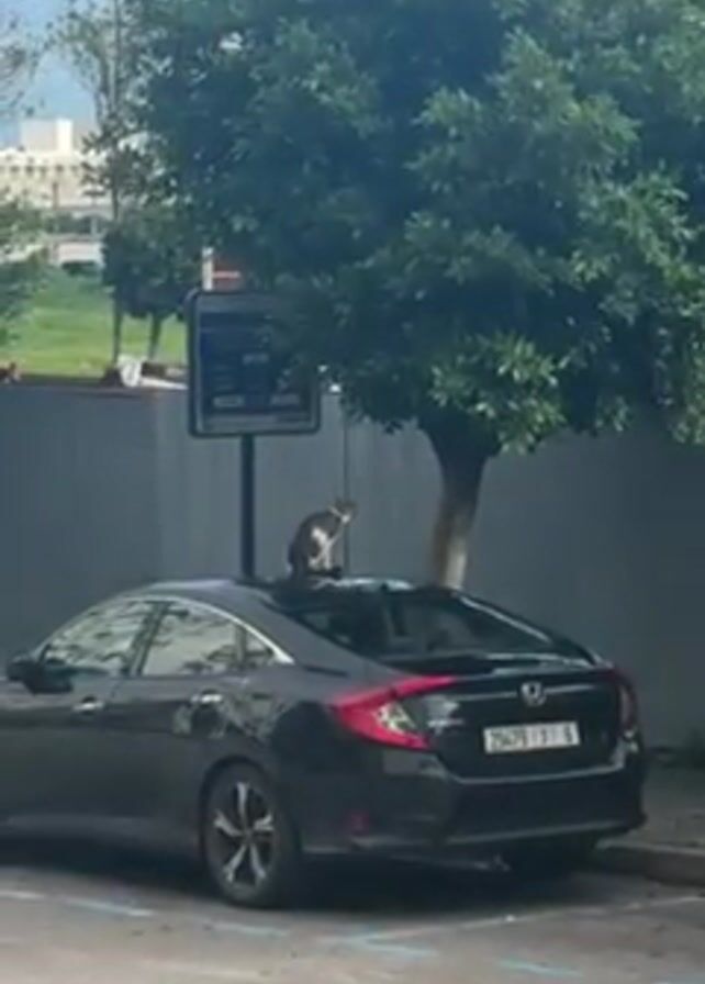 gray and white cat sitting on the roof of a black Honda Civic parked on the street. The cat is facing away from the camera. Behind the car is a tree, a sign in Arabic and French on a pole, and a low wall. The scene is outdoors during daylight hours. Traffic noises can be heard in the background.