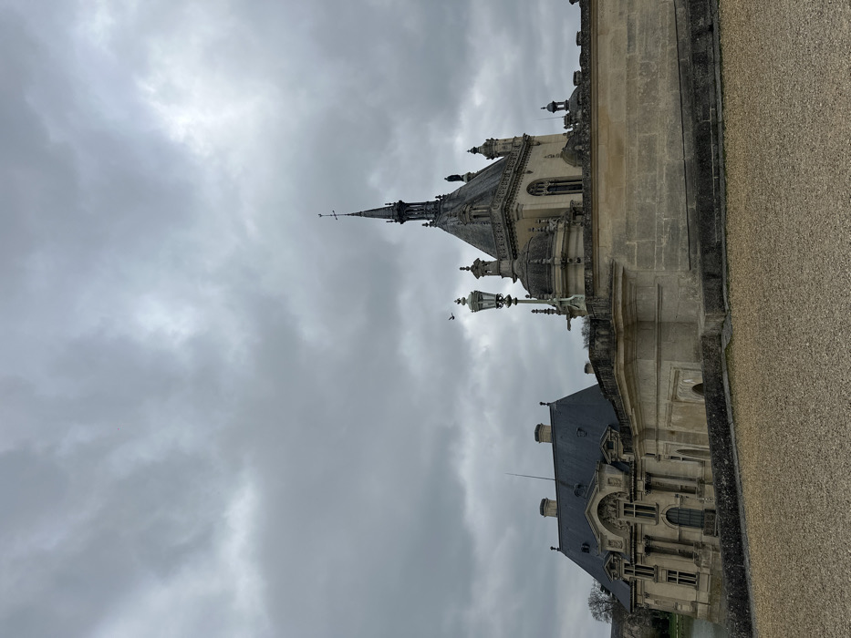 The image depicts a view of the Château de Chantilly, located in Chantilly, France (coordinates: 49.193, 2.486). The scene is captured from a slightly elevated vantage point, looking towards the back of the castle. The overcast sky, a dominant feature in the image, is characterized by a thick layer of gray clouds. A single bird is visible in flight against the sky. The castle is composed of two main sections, separated by a stone wall: a grand, symmetrical structure with a slate roof and decorative detailing, and a smaller, taller structure with a pointed spire. A lamp post stands in the foreground between the two sections, its light shining upward. The ground is a mix of gravel and dirt. The image's overall impression is one of grandeur and historical significance, enhanced by the dramatic, gray sky.