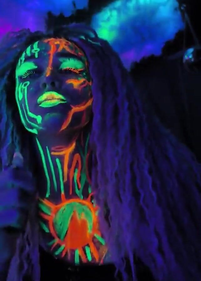 A person with long, purple, curly hair, is covered in neon green and orange paint in a design covering their face, neck and upper chest. The person is looking upwards with their eyes closed and mouth open. Their skin and hair are lit with a dark purple hue. A blurry, dark object is to the upper right of the person. A blurry blue and light green object is above the person. The person raises their right hand and it is clearly illuminated in the purple lighting, showing pink nail polish. A song is playing loudly.