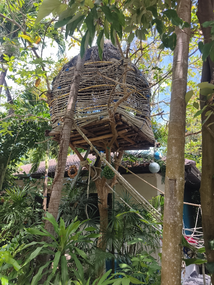 This image captures a densely vegetated outdoor scene in Baan Hua Thanon, Thailand, under bright daylight. The primary subject is an elevated, dome-shaped structure, approximately 3-4 meters high, constructed predominantly from interwoven ropes and natural fibers, resembling a large basket. This structure rests on a wooden platform supported by multiple tree trunks and timber beams. Blue plastic elements, possibly buoys, are visible within the rope weaving. The foreground and midground are dominated by dense tropical foliage, including palm trees, broadleaf plants, and various tree trunks. The sky, visible through gaps in the canopy, is clear blue. Ropes extend downwards from the elevated structure's platform, some appearing to function as access points while others serve as decorative elements. Several ornaments are suspended: a sun-shaped decoration of natural fibers, green pineapple-shaped objects, and spherical blue and grey buoys. In the background, partially obscured by the foliage, a building with a red-brown tiled roof and light-colored walls is visible. A white rope net or swing is partially discernible on the far right. No individuals are present in the scene.