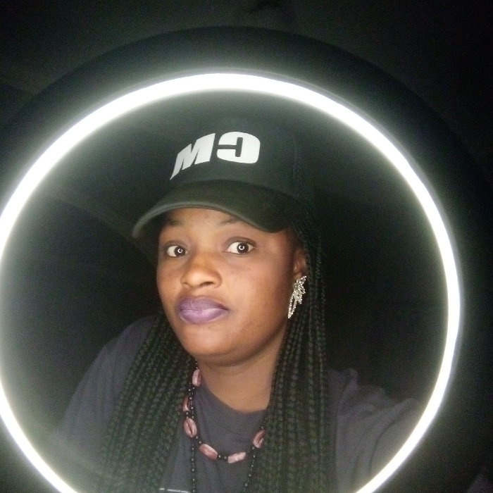 A woman with braided hair, wearing a black cap with "CW" on it, poses inside a ring light. She is also wearing an earring and a necklace with large pink beads. Her lipstick is a similar shade of purple as the beads. The background is dark. The focus is on her face and upper body.