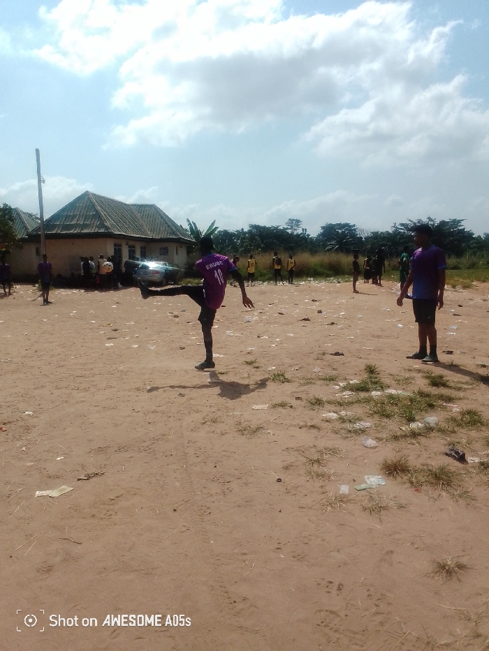 A dirt field is scattered with trash, where several people in matching purple shirts are gathered. One person is kicking a soccer ball with one leg raised in the air. A small building with a corrugated roof sits in the background along with a parked car and some trees. The sky is partially covered with clouds, indicating a sunny day.