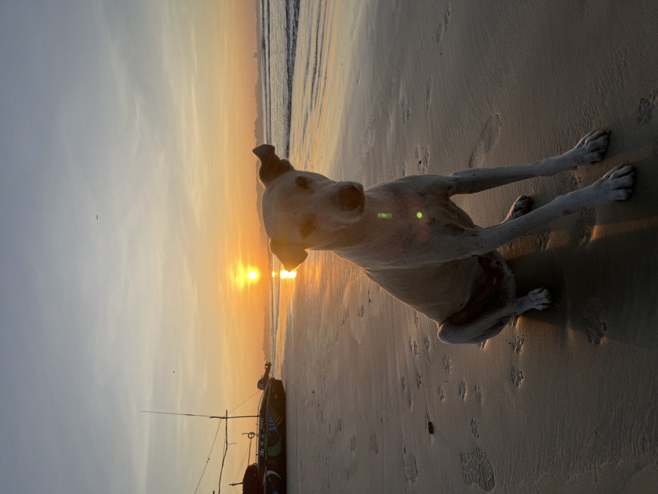 An off-center dog sits on a sandy beach, its front paws extended in front of it. The dog is light-colored with dark ears and casts a shadow on the sand which contains numerous footprints. The sun is low on the horizon, creating a bright orange glow that reflects on the water and sand. A small boat with a mast is partially visible in the lower left corner of the frame, silhouetted against the sun. The sky transitions from a pale blue to orange near the horizon.