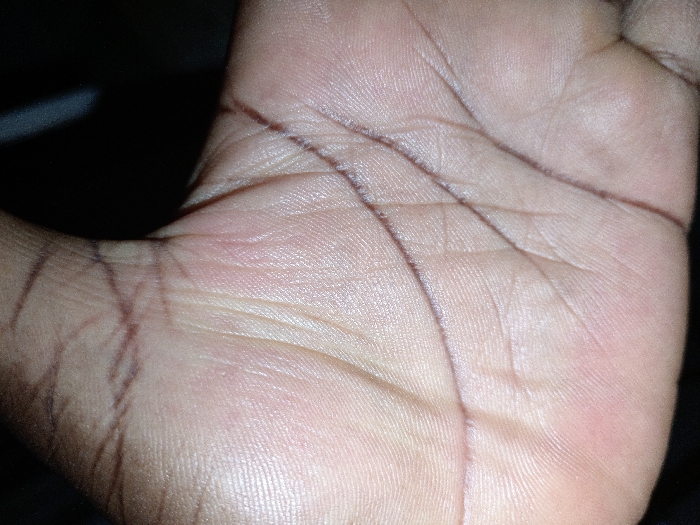 The image displays a close-up, high-angle view of a human palm, appearing to belong to an individual with light brown skin pigmentation