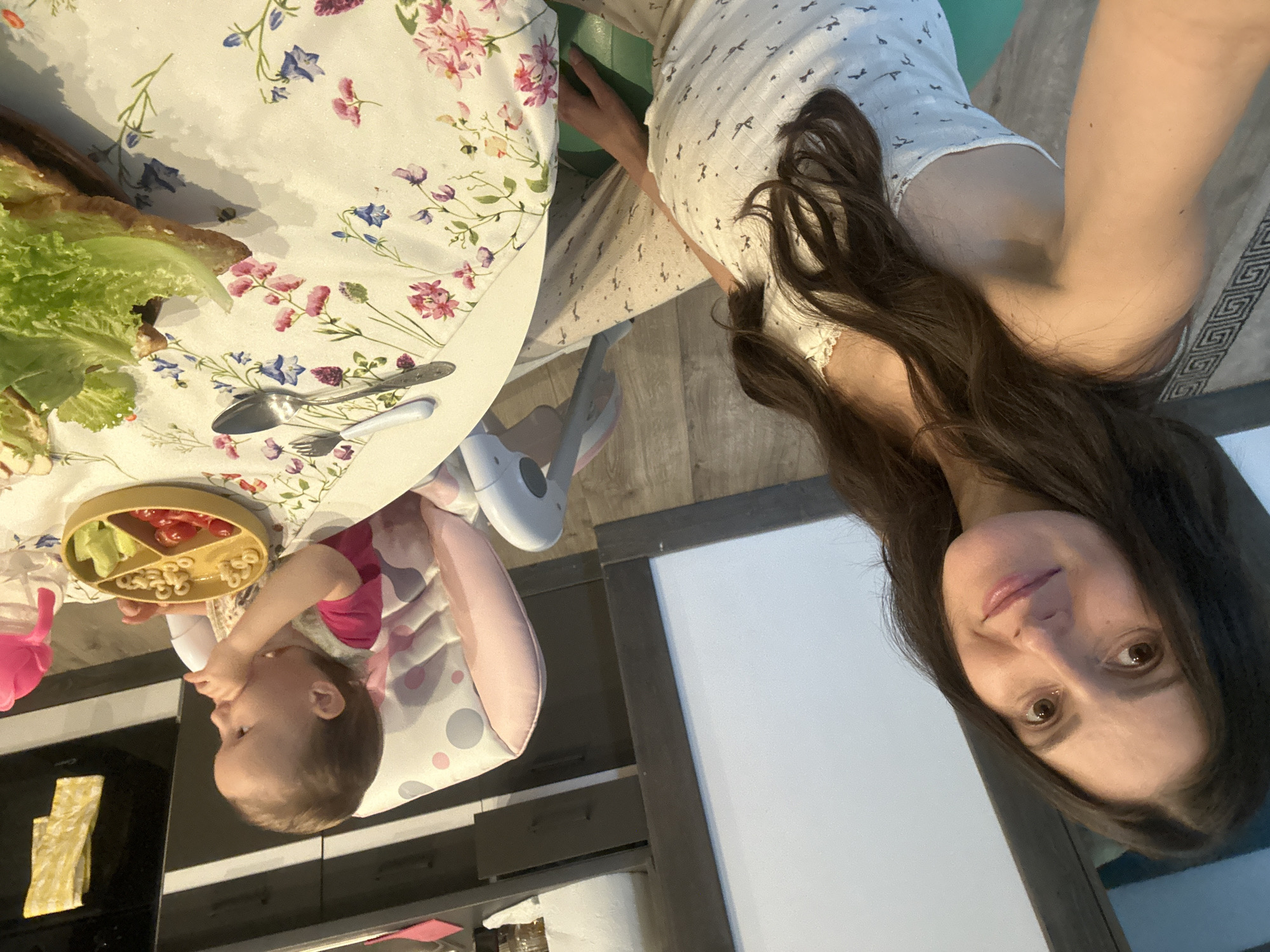The image presents a woman and a baby in a domestic setting. The woman, with long dark hair, is wearing a light-colored top. The baby is seated in a high chair at a table covered with a floral-patterned tablecloth. On the table, there is a plate of food, including what appear to be tomatoes, pasta rings, and green vegetables. There is also a fork and a spoon. The background shows a cabinet and a light-colored wall. The location is not specified in the image, so there is no information to state that the photo was taken in Wisła, Poland.