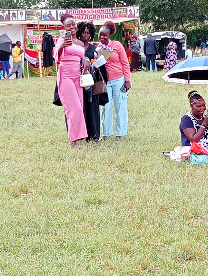 Three women are posing for a selfie in a grassy field. The woman on the left is wearing a pink outfit and holding a smartphone. The woman in the middle wears a black dress and looks at the camera. The woman on the right is in a pink shirt and blue pants, smiling at the phone. Behind them, there is a "Professional Photography" banner. In the background, there are other people, some with umbrellas, and a small vehicle. Another woman is sitting on the grass under an umbrella to the right.