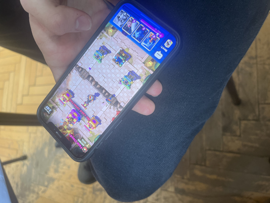 A person's left hand holds a black-cased smartphone, prominently displaying an active game of "Clash Royale