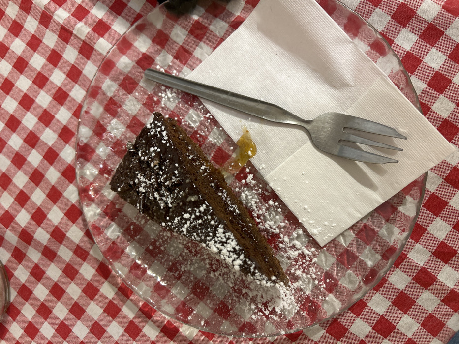 The image displays a close-up, overhead view of a dessert setting. A triangular slice of dark brown cake, approximately four to five inches long, is positioned on the left side of a clear, round glass plate with a textured rim. The cake's top surface features a glossy, dark brown glaze, uniformly dusted with white powdered sugar, and contains small, embedded, reflective flakes. A silver-colored, four-tine metal fork rests diagonally on a folded white paper napkin, which is placed on the right side of the plate. Between the cake and the napkin, on the glass plate, there is an irregular, viscous smear of yellowish-orange substance, consistent with fruit jam. Scattered powdered sugar is visible across the plate's surface around the cake. The entire assembly rests on a red and white checkered fabric tablecloth. The scene depicts an indoor dining environment, such as a cafe or restaurant, located within Budapest, Hungary. The specific establishment is not identifiable from the visual information. No people are visible, and no actions are in progress; the scene is static.