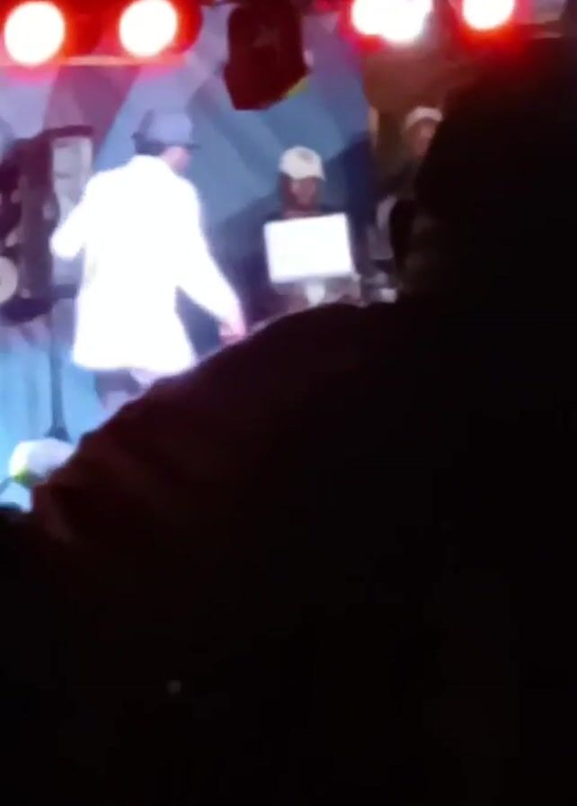 A medium shot captures a concert stage from the perspective of someone in the audience