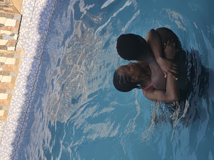 The image depicts two individuals, appearing to be adults, embracing in a swimming pool. The specific location within Asaba, Nigeria, cannot be determined from the visual evidence. The water is clear blue with surface ripples and reflections. The pool's edge is visible at the top, featuring a line of small blue mosaic tiles at the waterline, topped by a row of larger, irregularly shaped wall tiles in shades of beige, brown, and white. One individual, identified as female by braided hair and visible features, is positioned facing left, with her head resting close to the chest/shoulder area of the second individual. She wears a pink top, possibly a bikini top, and her arms are wrapped around the torso of the second individual. Her eyes are open, directed towards the second individual. The second individual, whose back is largely visible, appears to be male, wearing dark swimwear. His arms are also around the first individual, though mostly obscured by her. Both individuals have dark skin tones. They are submerged in the water up to their chests/shoulders. No other objects or people are distinctly visible in the immediate vicinity.