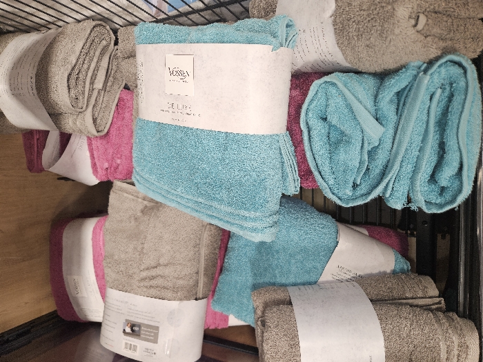 The image displays a cluttered arrangement of folded textile towels in a retail or storage setting within the city of Varna, Bulgaria