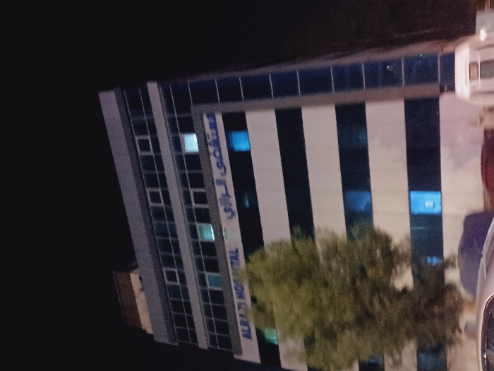 A multi-story building is captured in a low-light photograph. The structure has alternating vertical bands of white and dark-colored material, presumably walls and windows. "ALRAZI HOSPITAL" is written vertically in blue text. A green tree is situated in front of the building, partially obscuring the lower floors. The sky is dark, suggesting it is nighttime. A white car is visible on the right side of the image. The photo is slightly rotated, making the building appear tilted.