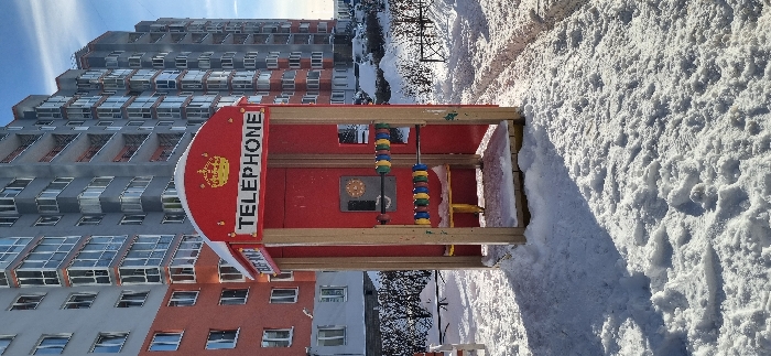The image depicts a red, wooden children's play telephone booth situated in a snow-covered outdoor area within Kudrovo, Russia