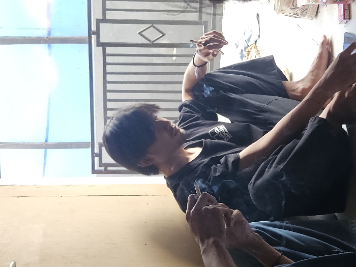 This image depicts three individuals in a semi-enclosed area, likely a residence, in Muka, Indonesia. The central figure is a young male with dark, medium-length hair, wearing a dark t-shirt and dark pants, sitting barefoot on a light-colored tiled floor. He holds a lit cigarette in his right hand, emitting visible smoke, and gazes downwards. Behind him is a dark metal railing with vertical bars and a central diamond design, beyond which a light blue-tinted window structure or sky is visible. To the left, the arm and lower leg, clad in blue pants, of a second individual are visible. This person also holds a lit cigarette, producing smoke, and is positioned near a dark smartphone on the floor. On the far right, dark hair, presumably belonging to a third individual, is partially visible. Adjacent to the third person, various items are scattered on the floor, including crumpled light-colored fabric, a white container, and a small pink rectangular object. A plain light brown wall forms the left background of the scene.