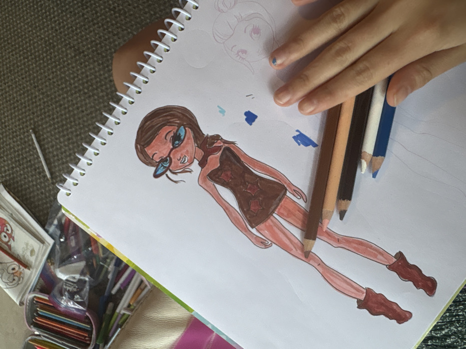 The image depicts an overhead view of an art activity, likely taking place in Valle de Bravo, Mexico, though the specific city location is not visually verifiable within the frame. The primary subject is an open white spiral-bound notebook, containing a colored drawing of a stylized female figure. The drawing portrays a standing figure with brown hair, tan skin, wearing blue-tinted sunglasses, a dark brown strapless mini-dress with reddish star patterns, a reddish scarf-like accessory on the left shoulder, and reddish-brown boots. To the right of this main drawing, a faint pencil outline of a stylized female head with rosy cheeks and closed eyes is partially visible. Several small, irregular blue marks are scattered on the page near the right side of the main figure. Five colored pencils (dark brown, light brown, peach/skin tone, white, and dark blue) are stacked diagonally across the lower right portion of the notebook page, partially obscuring the drawn figure's lower legs. A human hand, with light skin tone and extended fingers, rests on the bottom right of the notebook page, covering part of the stacked pencils. A small smudge of blue color is present on the fingernail of the middle finger. In the upper left background, a pink soft-sided pencil case filled with numerous colored pencils or markers is visible. Behind this, several stacked papers, possibly coloring book pages, are present, one depicting a partially colored cartoon duck-like character. A single white pencil or crayon lies on the background surface. The surface beneath the art supplies appears to be a textured grey material, possibly carpet.