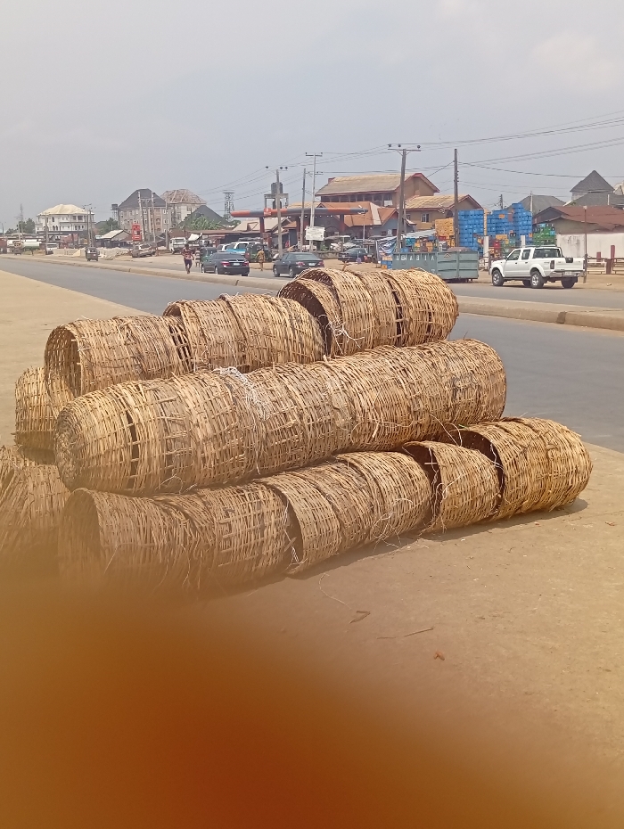 This image depicts an outdoor urban scene in Ura Nta Umuarandu, Nigeria. In the immediate foreground, numerous cylindrical, open-weave baskets, constructed from natural light-brown fibers, are stacked in multiple layers on a light-colored paved surface. The baskets vary in length and diameter. Adjacent to the stacked baskets, a multi-lane paved road traverses the midground. Several vehicles are present on the road, including dark-colored passenger cars and a white pickup truck, indicating traffic. A single pedestrian is visible walking on the far side of the road, moving from right to left. The background features a densely built-up area lining the street. Various commercial and residential structures are discernible, including a multi-story white building on the left and a gas station with a red and blue canopy. Numerous utility poles with overhead power lines are prominent throughout the urban landscape. The sky is hazy or overcast. No direct interactions between individuals are evident, and specific actions are limited to general vehicular and pedestrian movement.