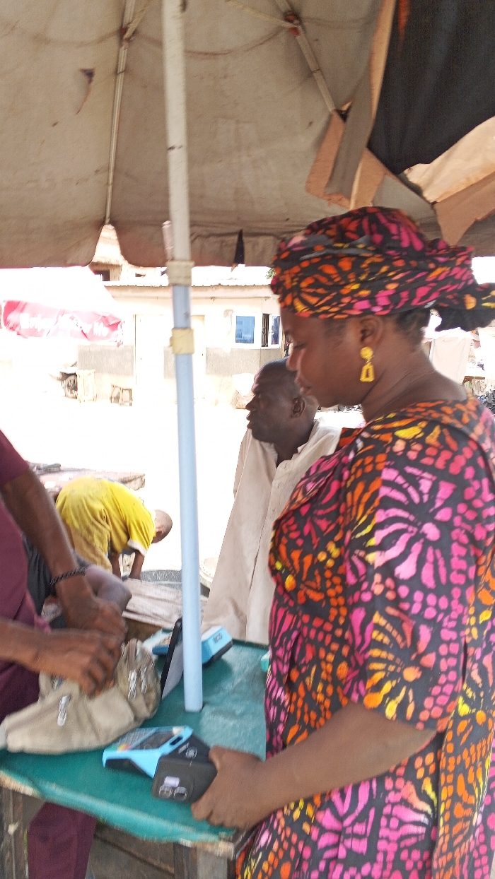The image depicts an outdoor commercial transaction in Tempure, Nigeria, occurring beneath a large, off-white market umbrella supported by a light blue pole