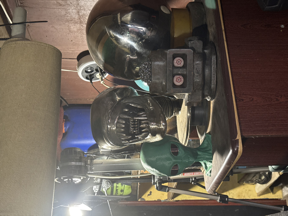This image, originating from Sumy, Ukraine, depicts an artificially lit indoor space, likely a workshop or display area, featuring several science fiction-themed objects. Centrally positioned on a dark-red laminate-topped wooden cabinet, a large, dark, glossy replica of a Xenomorph head, exhibiting an elongated cranium and a detailed inner jaw with sharp teeth, dominates the view. To its immediate left stands a smaller, matte green, 3D-printed bust of a Grey alien, characterized by large, empty eye sockets. To the right of the Xenomorph head, a dark, angular, robotic head-like object is present; it features two prominent, spherical, red-veined eye components and an open top filled with dark, granular material. A reflective, dark, helmet-shaped object is partially visible behind and to the right of the robotic head. The background includes a white, circular power strip mounted on the wall with multiple cables plugged in, and a large blue plastic container. On the far left, a bright artificial light source, likely a lamp on a visible tripod stand, illuminates the scene. The ceiling is covered with a textured, beige textile material, and the walls exhibit varied finishes, including reddish-brown and lighter tones.