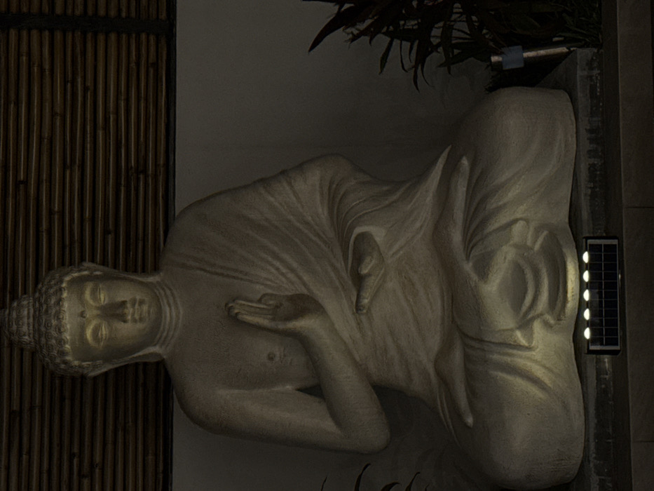 A light-colored Buddha statue, appearing to be crafted from stone or concrete, is centrally depicted in a seated meditative posture, its legs crossed. The statue's right hand is raised in Vitarka Mudra, with the thumb and forefinger touching, while the left hand rests palm-up in Varada Mudra. Its face presents a serene expression with closed eyes, faintly illuminated. A black rectangular solar-powered LED light strip, equipped with five illuminated bulbs, is positioned on a ledge directly in front of the statue's base, providing upward illumination. Behind the statue, a horizontal bamboo mat is mounted above a plain light-colored wall. Dark, leafy foliage is visible to the immediate right of the statue, partially revealing a slender, blue-capped stake. This scene is captured under low-light conditions in Ko Samui, Thailand.