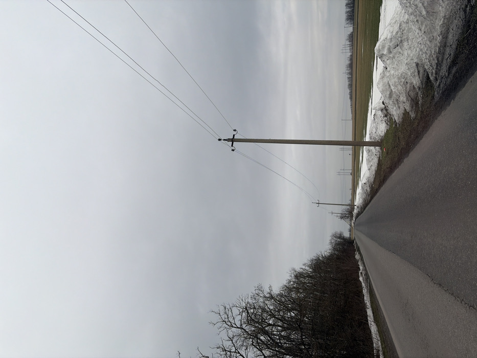 The image displays a rural asphalt road in Bessergenovka, Russia, extending into the distance under a uniformly overcast grey sky. On the left side, a dense, linear grouping of leafless deciduous trees and shrubs forms a dark barrier along the roadside. Patches of dirty snow and exposed earth are visible on the ground beneath these trees. On the right side of the road, a wide, open field is partially covered with large, irregular mounds of dirty, melting snow. Beyond the snow, the field exhibits areas of green vegetation and dark soil. A series of concrete utility poles, each fitted with insulators and supporting multiple overhead electrical wires, runs parallel to the road on the right, receding into the far distance. No individuals, vehicles, or active subjects are present in the scene. The overall environment suggests a late winter or early spring season due to the bare trees and residual snow cover.