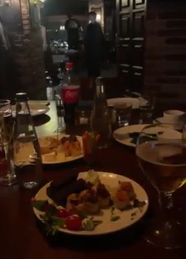 table in a pub or restaurant setting. Plates of food with various appetizers are visible, along with drinks like beer, water, and a bottle of Coca-Cola. Several people are standing near the doorway in the background. The lighting is dim, and the decor includes brick walls and sconce lighting.