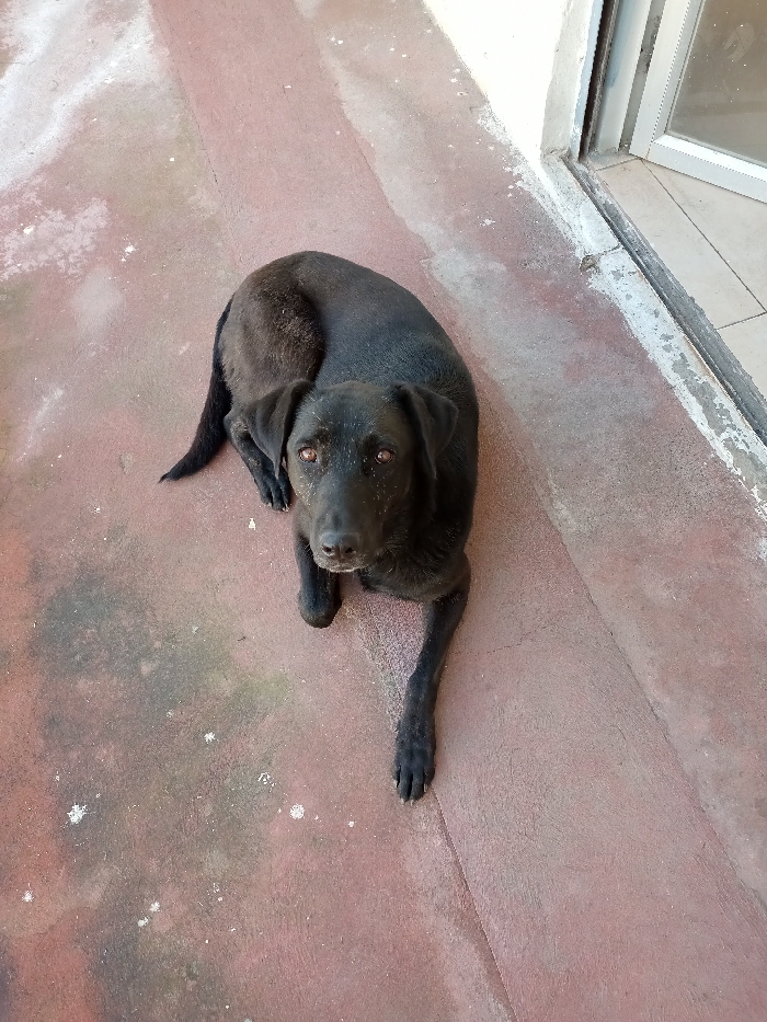 - "A black Labrador dog lies on a red-tinted concrete floor with mottled gray and white spots" by FM-GeBdt2, licensed under CC BY 4.0