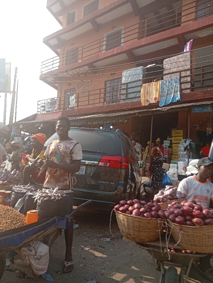 A bustling outdoor market scene showcases vendors and their wares. One vendor stands beside a cart filled with nuts and dried fish. Nearby, another vendor displays baskets overflowing with red onions. A dark SUV is parked in the background, partly obstructing a building with a rusty-orange façade. Mattresses and clothing are hung out to dry on the balconies above the market stalls. People mill about, creating a vibrant atmosphere.