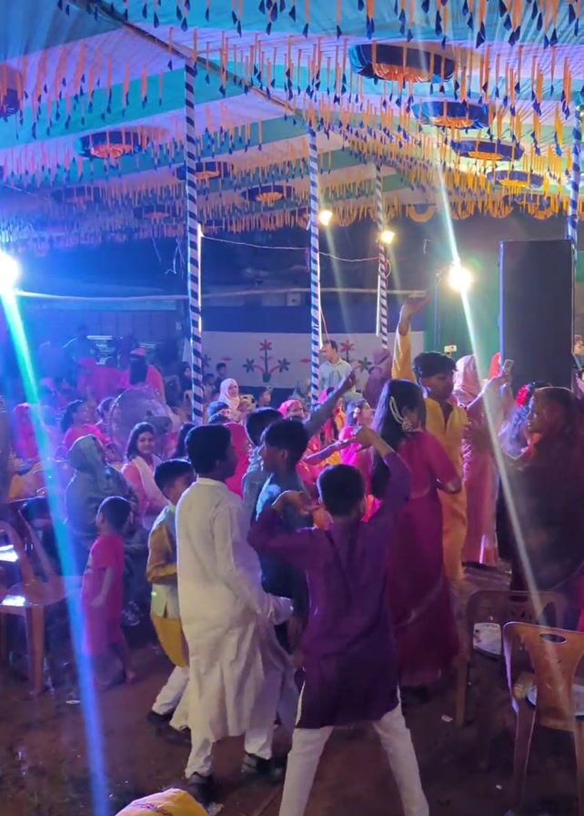 A group of people are dancing in a tent. There are men, women, and children dressed in colorful clothing, mostly pink, yellow, white, and purple. Some are seated on chairs around the dance floor. The tent is decorated with blue, green, orange and yellow streamers hanging from the ceiling. There are lights overhead, creating a bright atmosphere. A small stage is visible in the background. Some people are smiling and laughing. The overall atmosphere is festive and celebratory.