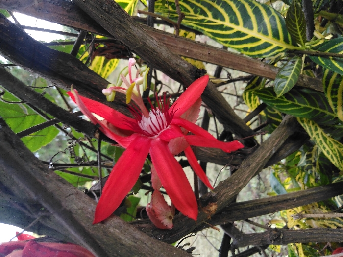 A close-up image depicts a single red flower, consistent with a *Passiflora* species, situated in an outdoor botanical environment within the city of Chan-Nua, Laos. The flower features five prominent, pointed red petals. Its center reveals a corona of white and red striped filaments, from which light green to yellowish anthers and pistils extend. The flower is intertwined with and partially framed by multiple brown, woody stems or vines. In the lower right portion of the image, distinct foliage with prominent yellow and green variegated patterns is visible. Additional green foliage, some out of focus, comprises the background and upper left. The scene is illuminated by natural light. No human subjects, animals, or man-made objects are discernible within the frame.