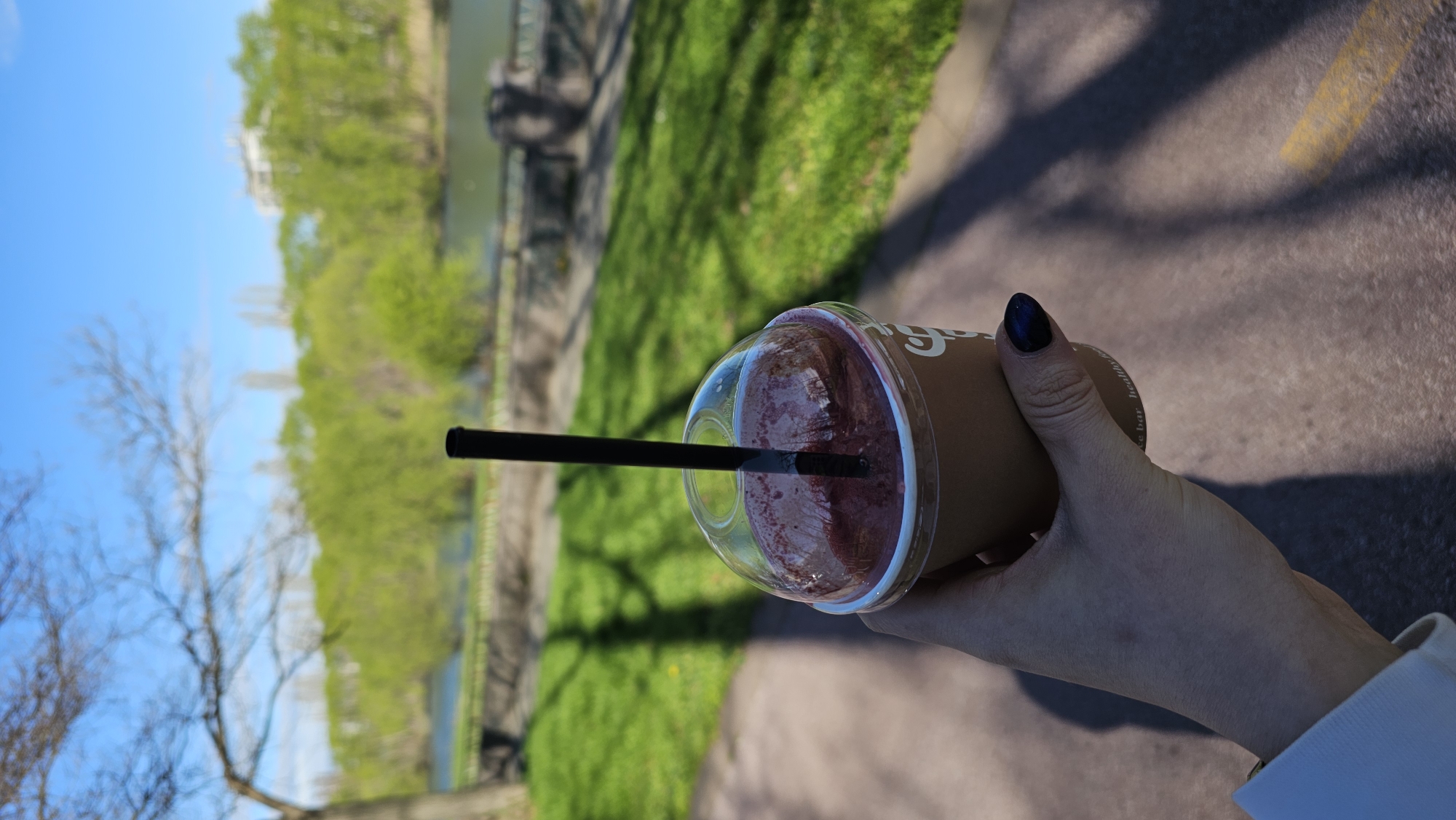 A person is holding a smoothie in a cup with a lid and a black straw, outside on a sunny day. The background shows trees, a river, and a path. The location appears to be along the Maritsa River in Plovdiv, Bulgaria.