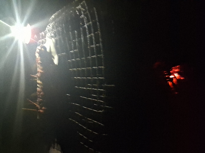 The image depicts a nighttime or low-light scene focused on a grilling operation