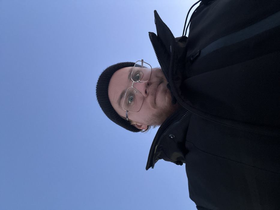 - "An upward-angle selfie shows a person wearing a black beanie, wire-frame glasses, and a dark winter coat against a clear blue sky" by FM-4gZRE3, licensed under CC BY 4.0