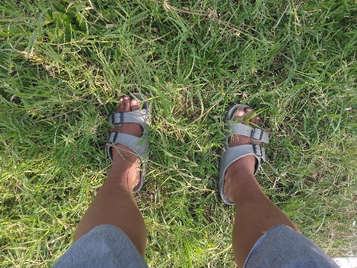 The image displays a top-down view of a person's lower legs and feet, positioned in an expanse of green grass. The subject is wearing a pair of light gray open-toed sandals with two adjustable straps on each foot, covering the toes and midfoot. The skin visible on the lower legs and feet is a medium to dark brown tone. The individual is also wearing gray shorts, visible from the mid-thigh down. The surrounding environment consists of lush, untrimmed green grass, with varying heights and densities, suggesting an outdoor, natural setting. Shadows are visible within the grass, indicating direct sunlight from above. The scene is located in Unknown, Norway.
