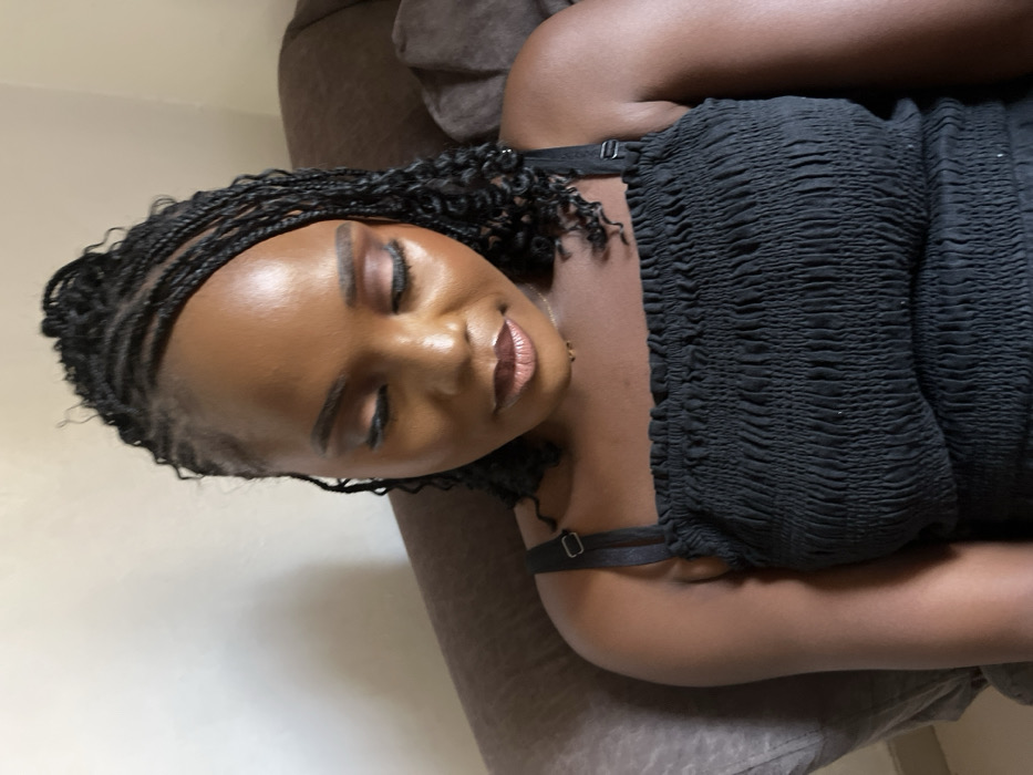 A close-up, chest-up portrait depicts a dark-skinned female subject situated indoors in Abuja, Nigeria. The individual is looking downward, with eyes partially closed, displaying full facial makeup including defined eyebrows, pinkish eyeshadow, winged eyeliner, false eyelashes, and glossy nude-pink lipstick. Her hair is styled in cornrows on the scalp, transitioning into micro braids with curly ends that frame her face and extend over her shoulders. She wears a black, shirred (smocked) strapless top with visible black adjustable shoulder straps. A thin, light-colored necklace is present around her neck. The subject is seated against a dark brown upholstered surface, consistent with a sofa or chair. A plain, light-colored wall is visible in the upper left background.