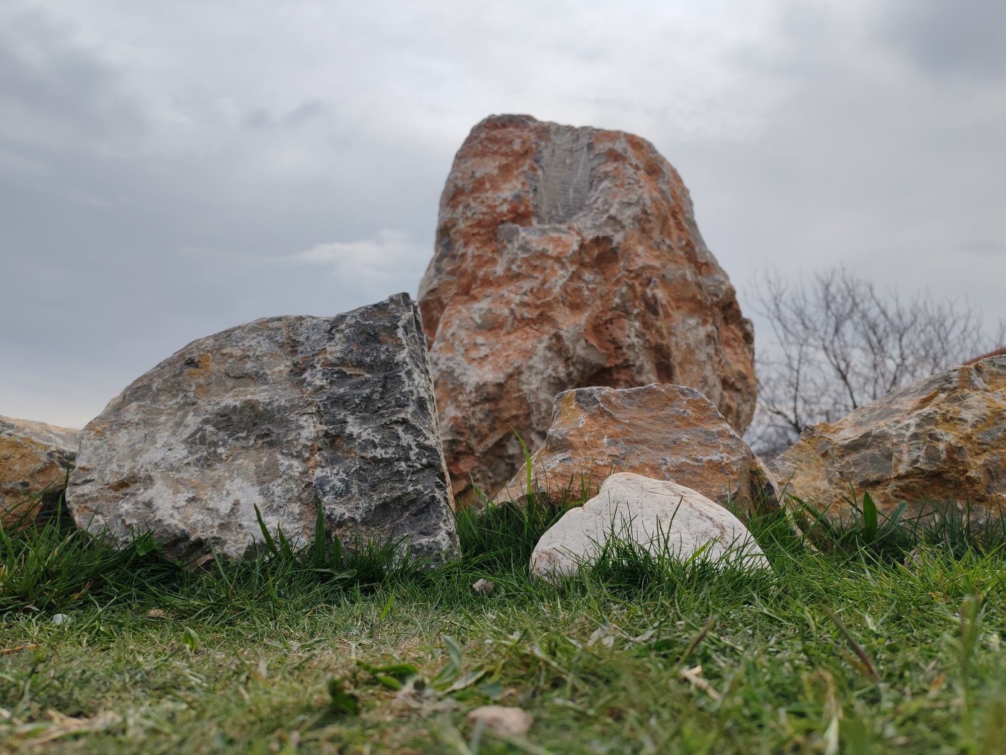 The image displays an outdoor scene in Blajievo, Bulgaria, featuring a cluster of large rocks on a grassy landscape under an overcast sky. The foreground is comprised of thick green grass, within which minor debris is present. In the midground, several substantial rocks are arranged. A large, angular rock with grey, black, and white coloration stands on the left. Centrally, further back, a tall, reddish-orange rock with grey and white marbling exhibits a prominent, deeply eroded vertical groove on its upper section. To the right, additional rocks with brown and grey tones are visible, alongside a smaller, smooth, ovoid white rock partially embedded in the grass. The background consists of a uniformly cloudy, grey sky. Bare, leafless branches of a deciduous tree are discernible against the sky on the far right. No individuals, animals, or specific actions are depicted.