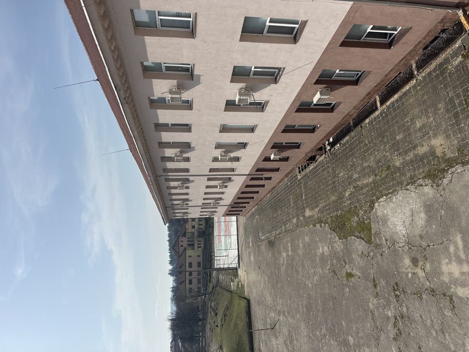 The image presents an exterior view of a multi-story building located in Cherven Bryag, Bulgaria, under a clear, sunlit sky with scattered wispy clouds. The building features a two-toned facade: a light beige or pinkish hue on the upper three visible floors and a reddish-brown color on the ground floor. Numerous rectangular windows with white frames are systematically arranged across the facade, with multiple external air conditioning units mounted beneath them. The building is topped by a red-tiled roof with overhanging eaves, from which two slender lightning rods extend upwards. In the immediate foreground, a cracked, grey concrete or asphalt surface extends from the lower left, transitioning to a patterned walkway of interlocked pavers running parallel to the building's base. Patches of moss and dry grass are visible in the cracks and along the edges of these paved areas. Further into the mid-ground, to the left of the main building, an outdoor sports court with distinct red, green, and white colored markings is partially visible, enclosed by fencing. Beyond this, a grassy, sloped area leads towards distant residential buildings featuring light-colored facades and reddish roofs, interspersed with bare deciduous trees and some evergreen foliage. The scene appears devoid of human presence or active interactions.
