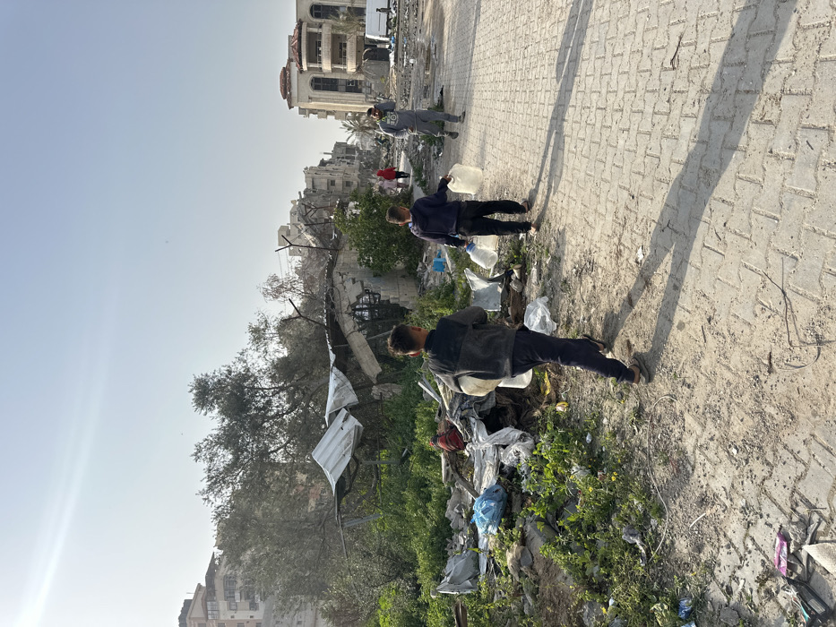 Three people are standing on a paved street in Gaza, Unknown. The street is strewn with debris, including a large amount of rubble from a destroyed building. The people are all wearing dark clothing. One person is carrying a large water container. There are buildings in the background, some of which are damaged. There is a large tree growing to the left. The image is taken from a low angle, giving the viewer a perspective looking up at the people.