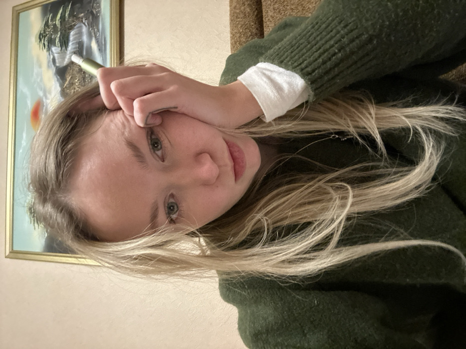 A woman poses for a selfie, holding a pen to her forehead. She has blonde hair and fair skin. She's wearing a green sweater with a white cuff visible underneath. Her expression appears tired or thoughtful. A framed painting hangs on the wall behind her, featuring a landscape scene in muted colors, including what appears to be a sunset. The background consists of a beige wall with light brown, possibly wooden paneling.