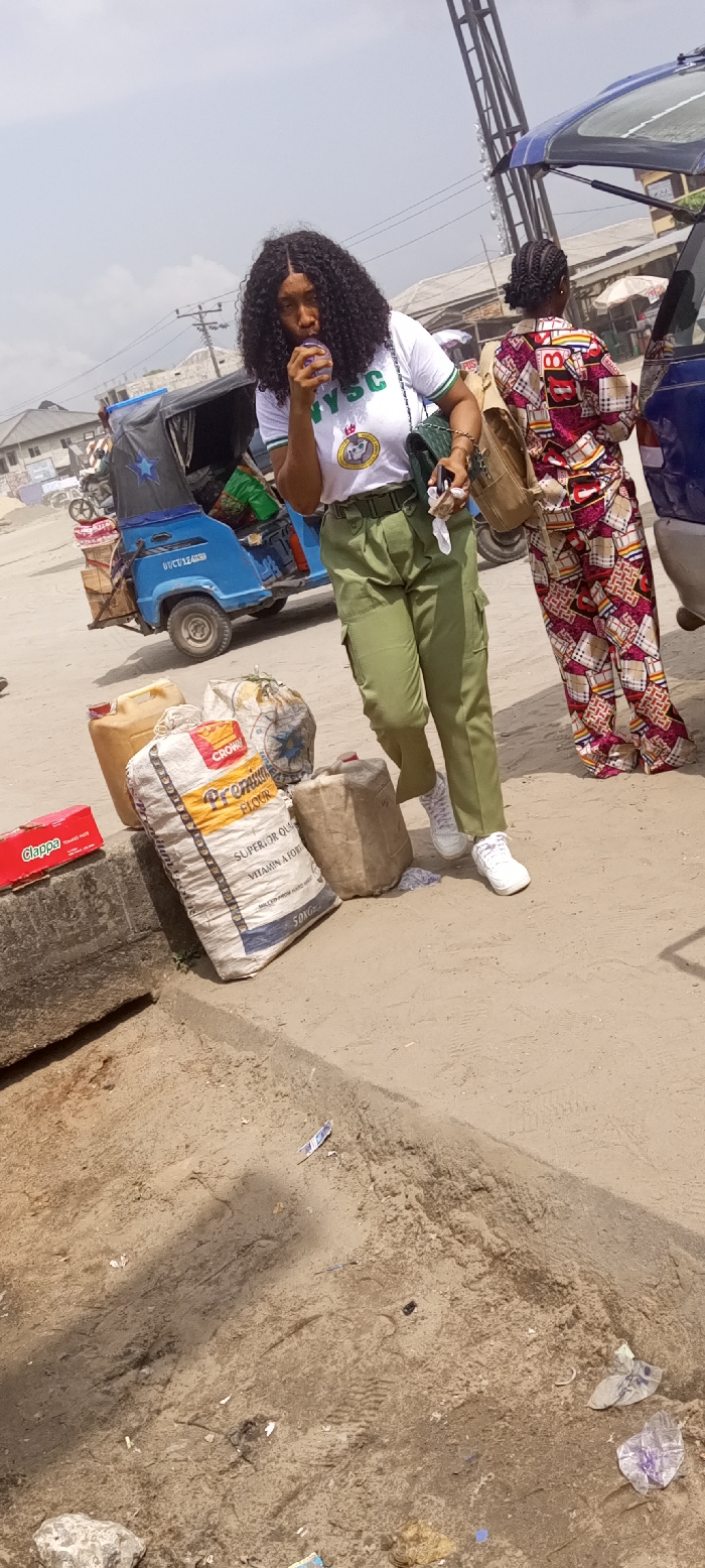 The scene depicts an unpaved street or marketplace in Ohoro, Nigeria, under a clear, bright sky. In the foreground, a young adult female with dark, curly hair is visible, oriented slightly towards the left. She is wearing a white short-sleeved top with green trim and an "NYSC" logo, olive-green cargo pants, and white athletic shoes. She is actively drinking from a small, translucent purple container held to her mouth with her left hand, while her right hand holds a small white item, possibly a tissue. A dark green handbag with a silver chain strap is slung over her left shoulder. To her right and slightly behind, a second female is partially visible from the back, wearing a brightly patterned two-piece outfit in shades of red, pink, and white. Her hair is braided and pulled back. She stands near the open rear tailgate of a dark blue vehicle, which appears to be a car or SUV. To the left of the main subject, a blue motorized tricycle, commonly known as a Keke Napep, is parked. It features a black canopy, a blue body with a white star logo, and "NYSC FCT/124MH" written on its side. Items are visible loaded in its rear cargo area. On the sandy ground in the mid-ground, a collection of objects is placed on or near a low concrete structure. These include several plastic jerrycans of varying sizes and colors (yellowish-brown, tan) and two large sacks. One sack is clearly labeled "CROWN Premium Flour Superior Quality Vitamin A Fortified 50KG." Another sack bears a blue star logo. A red box labeled "Clappa Toothpaste" rests on the concrete structure. The ground consists of packed sand and dirt, showing footprints and tire tracks, with scattered pieces of litter, including plastic wrappers and paper. In the background, indistinct buildings and utility poles with overhead wires are visible under the bright daylight.
