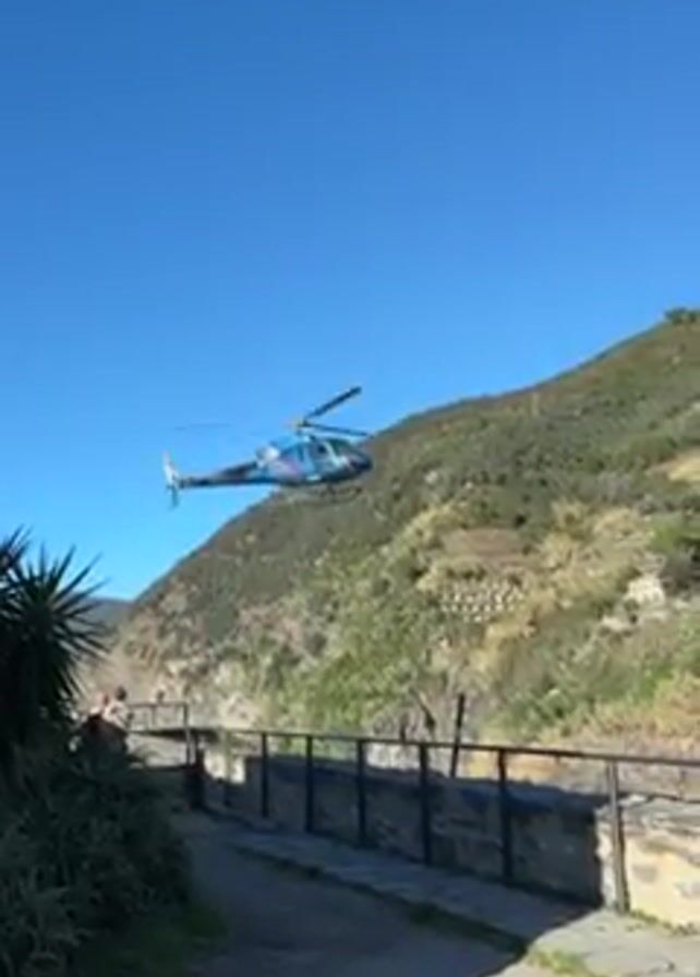 A blue and black helicopter flies against a clear blue sky and past a green hillside. A thin cable hangs down from the helicopter. A gray stone walkway with a black metal fence sits below the helicopter. There are green plants on either side of the walkway. Three people are standing near the plants.