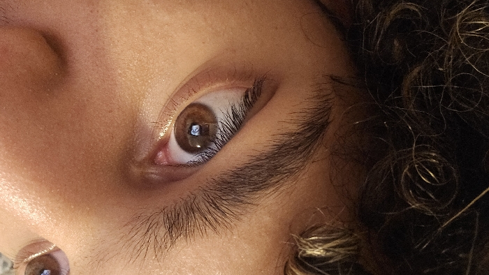 A tightly cropped, upward-angled photograph presents the right side of an individual's face, dominated by the right eye. The subject possesses a medium-brown complexion. Dark, curly hair with scattered lighter streaks is visible on the left periphery of the frame. The right eye is open, revealing a dark brown iris and a pupil with a sharp, rectangular reflection, consistent with a digital screen displaying a light-colored image. The right eyebrow is dark and dense. The skin around the eye and on the visible cheek area exhibits distinct pores and a subtle oily sheen. A portion of the bridge of the nose is present on the right, and the upper right corner of the image shows a partial view of the left eye. The photograph lacks any discernable environmental details to establish its specific location within Kamenz - Kamjenc, Germany.