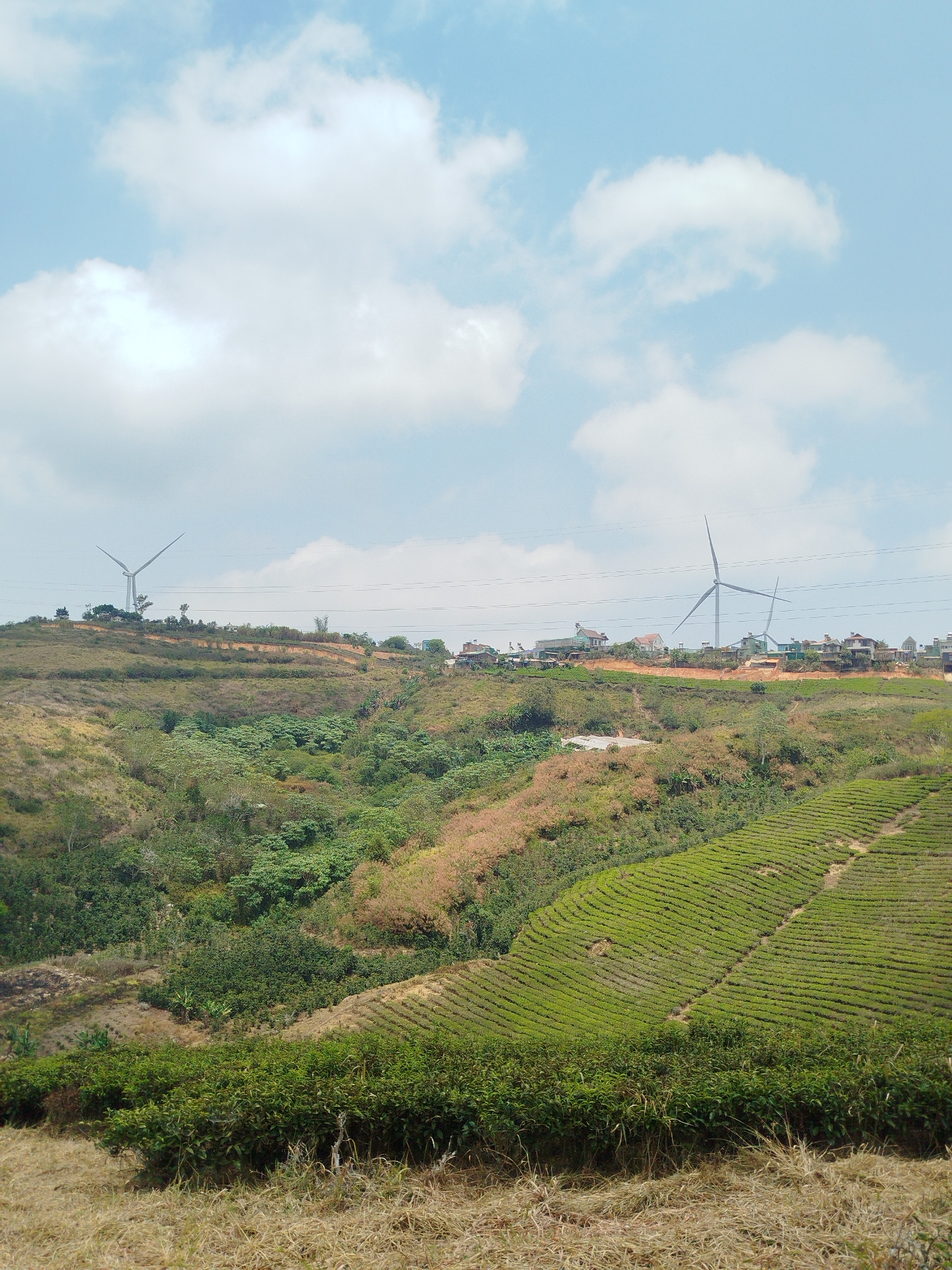 landscape in Trường Thọ, Vietnam, featuring rolling hills under a partly cloudy sky. Two wind turbines stand atop one hill, with houses scattered nearby. Power lines stretch across the scene. A valley with dense green vegetation lies between the hills. In the foreground, a hillside is cultivated with terraced rows of tea plants. The immediate foreground shows dry grass and shrubs.