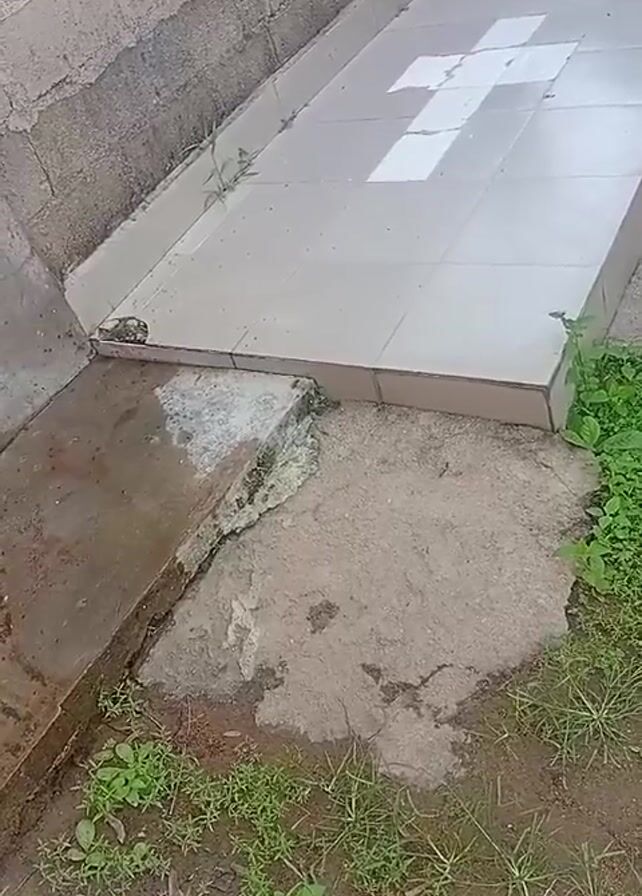 still, high-angle shot of a tiled structure with a white cross design on top, situated next to a weathered concrete surface and a brick wall. The surrounding area is covered with patches of grass and small plants. The structure appears to be outdoors, possibly in a garden or a backyard. There are no people or actions visible in the video.