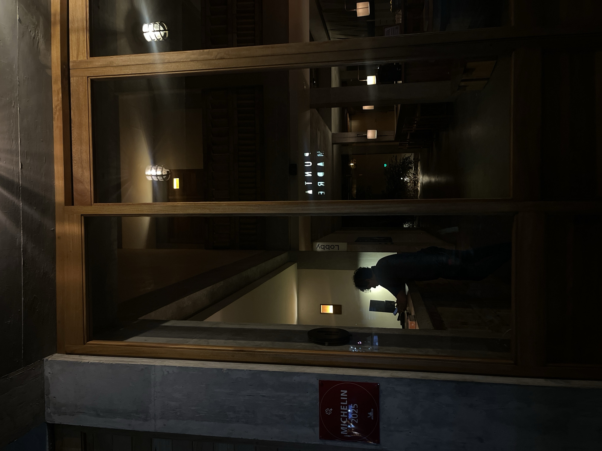 A nighttime view through a glass window and wooden frame reveals the interior of a building, possibly a hotel or restaurant, in Brisas de Zicatela, Mexico. The illuminated interior is reflected on the glass. In the lower right section, a person with dark curly hair is bent over a counter, looking at a cell phone. A “Lobby” sign hangs on the wall above the person. On the lower-left, a gray concrete facade is visible with a red Michelin plate mounted on the wall. The sign on the interior reads “Punta Madre”. Interior lighting fixtures, including circular and square lights, are visible. Beyond the lobby, there is a dimly lit corridor with plants, indicating an outdoor area.
