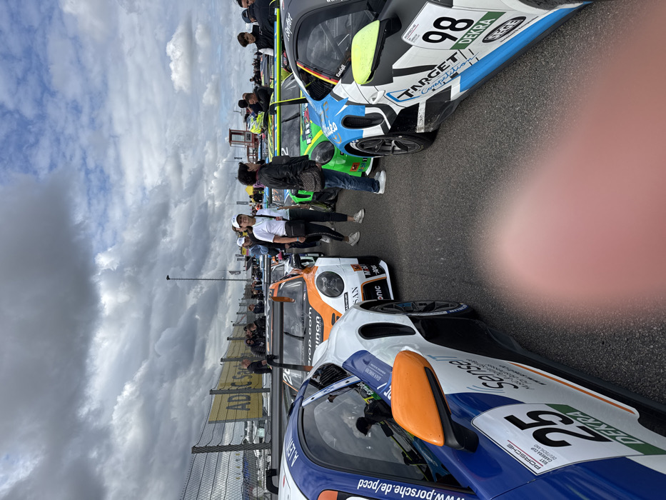 The image displays an outdoor scene at the Sachsenring circuit in Hohenstein-Ernstthal, Germany, under a partly cloudy sky. Multiple Porsche 911 GT3 Cup race cars are stationary on an asphalt surface, likely a pit lane or pre-grid area. In the immediate foreground on the left, the blue, white, and orange side of a race car, numbered "25" and branded with "PORSCHE" and "DEKRA", is visible, featuring an orange side mirror. Directly to its right, an orange and white race car with "16" partially visible and "Gronau" branding is parked. Further right, a green and black race car, partially displaying "2" and "FIM" logos, is positioned. On the far right, the black, blue, and white side of a car with race number "98" and "TARGET Competition" and "DEKRA" branding is present, showing neon yellow accents. Approximately fifteen to twenty individuals are standing on the asphalt among the race cars. A woman in a white t-shirt, white cap, and black pants is prominently featured in the mid-ground, looking right, with a lanyard visible. To her right stands another woman in a dark jacket and jeans, carrying a shoulder bag. Other individuals are scattered further in the background, some near the cars, others near the trackside barriers. The background features metal catch fencing topped with chain-link fence, behind which a yellow banner with "ADAC" is partially visible. A small, red-and-white striped structure, possibly an observation post, is discernible in the far right background. The lower central portion of the image is obscured by a blurred human finger.
