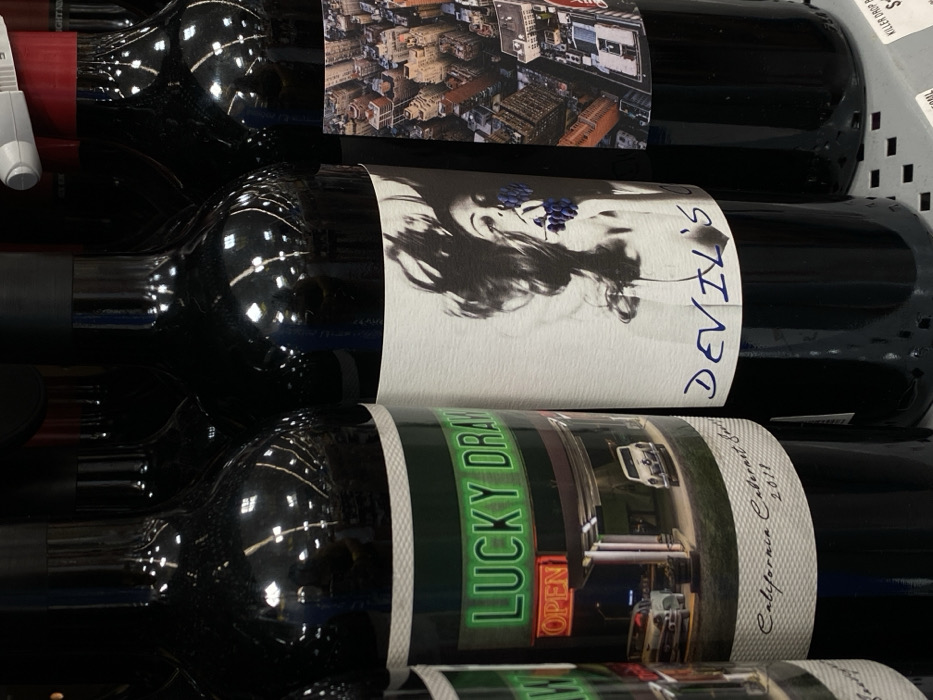 Several wine bottles are stacked. The top bottle features an aerial view of a city, the middle bottle has a black and white image of a woman with grapes over her eyes, and the word "Devil's" written vertically in blue. The bottom bottle reads "Lucky Draw" in green neon-style lettering and displays a photo of a diner or restaurant. It also includes "California Cabernet 2011" written in smaller text.
