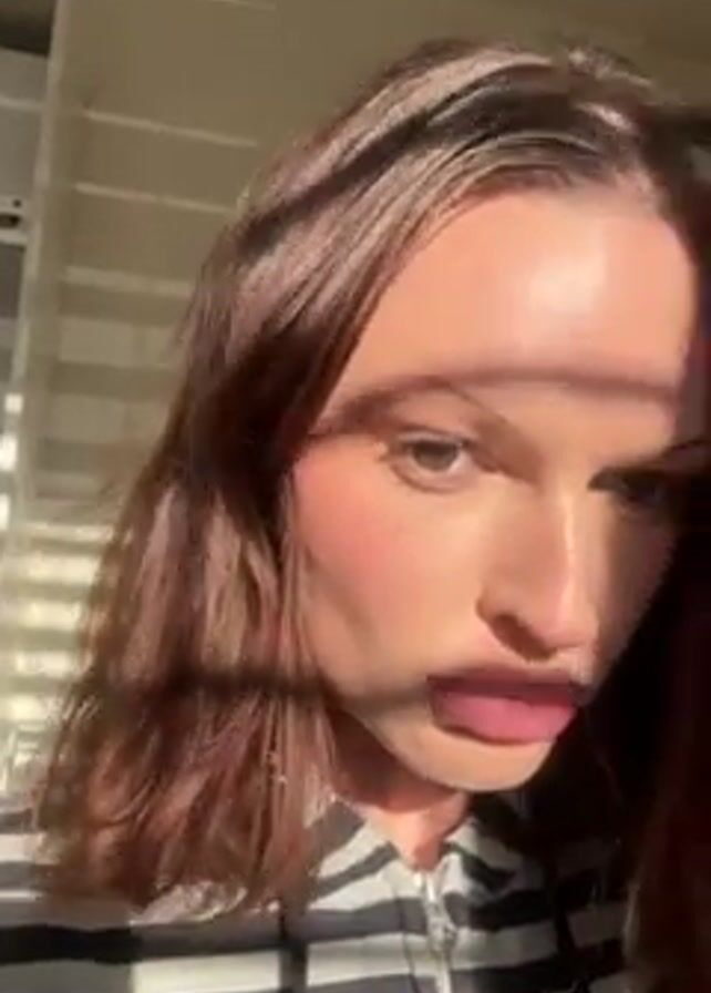 A woman with auburn, shoulder-length hair is facing the camera. She wears a gray and white striped zip-up hoodie. Sunlight shines through window blinds, casting striped shadows across her face. She smiles at the camera. The background is a plain, light-colored wall with white shelves. Music plays softly in the background.