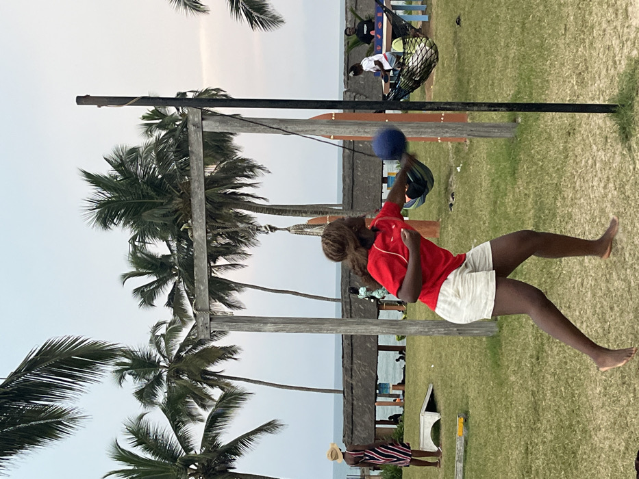An outdoor scene in Kasoa, Ghana, depicts a coastal recreational area during daylight hours, likely late afternoon. In the foreground, a barefoot individual with dark hair, wearing a red short-sleeved top and light-colored striped shorts, is actively hitting a dark blue speed bag suspended from a black vertical pole. Their left arm is extended towards the bag, while the right arm is bent near the chest. The midground features a grassy expanse with several wooden structures. A large wooden frame, resembling a pergola, stands centrally, with a dark green net hammock suspended from its right side, containing a partially visible person. Further left, another person wearing a striped dress and a straw hat stands near a white slanted object on the grass. Closer to the thatched-roof structure along the coastline, another individual is visible in a light green dress. To the far right, a person is seated at a table. Two decorative surfboards lean against a pole to the right of the wooden frame. In the background, the ocean is visible with a discernible shoreline, featuring waves breaking. Along the shore, a structure with a thatched roof supported by posts is present. Numerous palm trees, tall and slender, are scattered across the background and midground, reaching towards the pale, slightly overcast sky.