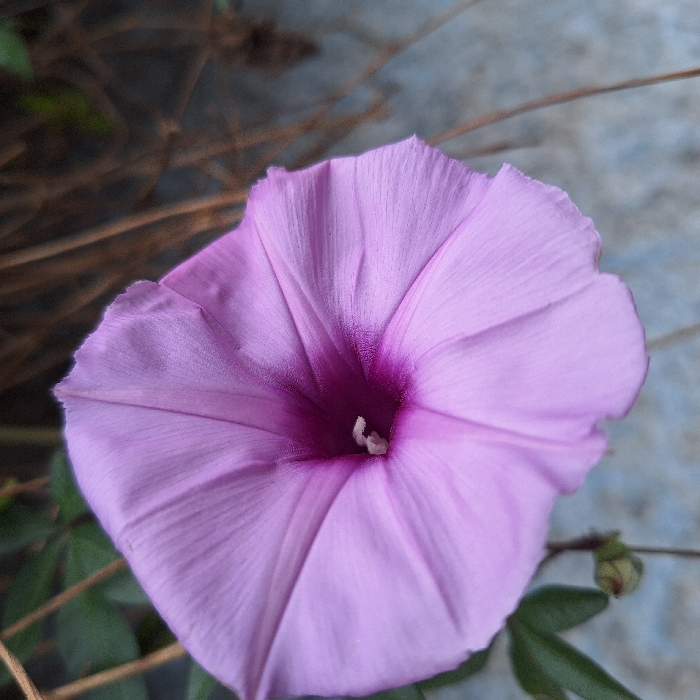 A full bloom morning glory flower is prominently displayed, its petals exhibiting a gradient from light purple to a deep magenta at the center. Inside, a white pistil adds contrast. The petals are smooth with subtle veins. Surrounding the flower are hints of its natural habitat with green leaves and slender brown vines. The backdrop is a muted blend of grey and light blue.